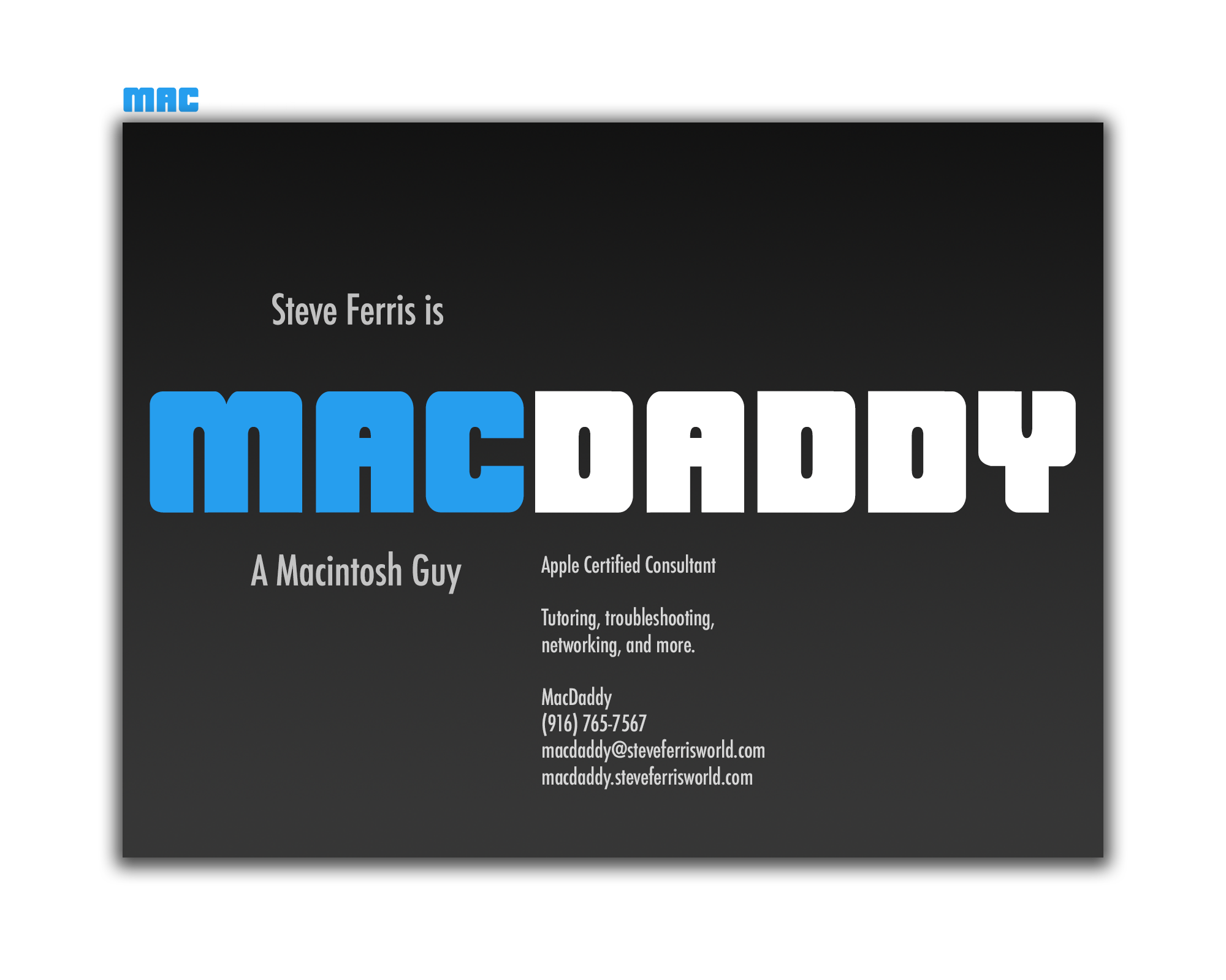 MacDaddy Year: 2008 Employer: Type of site: Marketing Skills used: Adobe Photoshop, CSS, Design, HTML