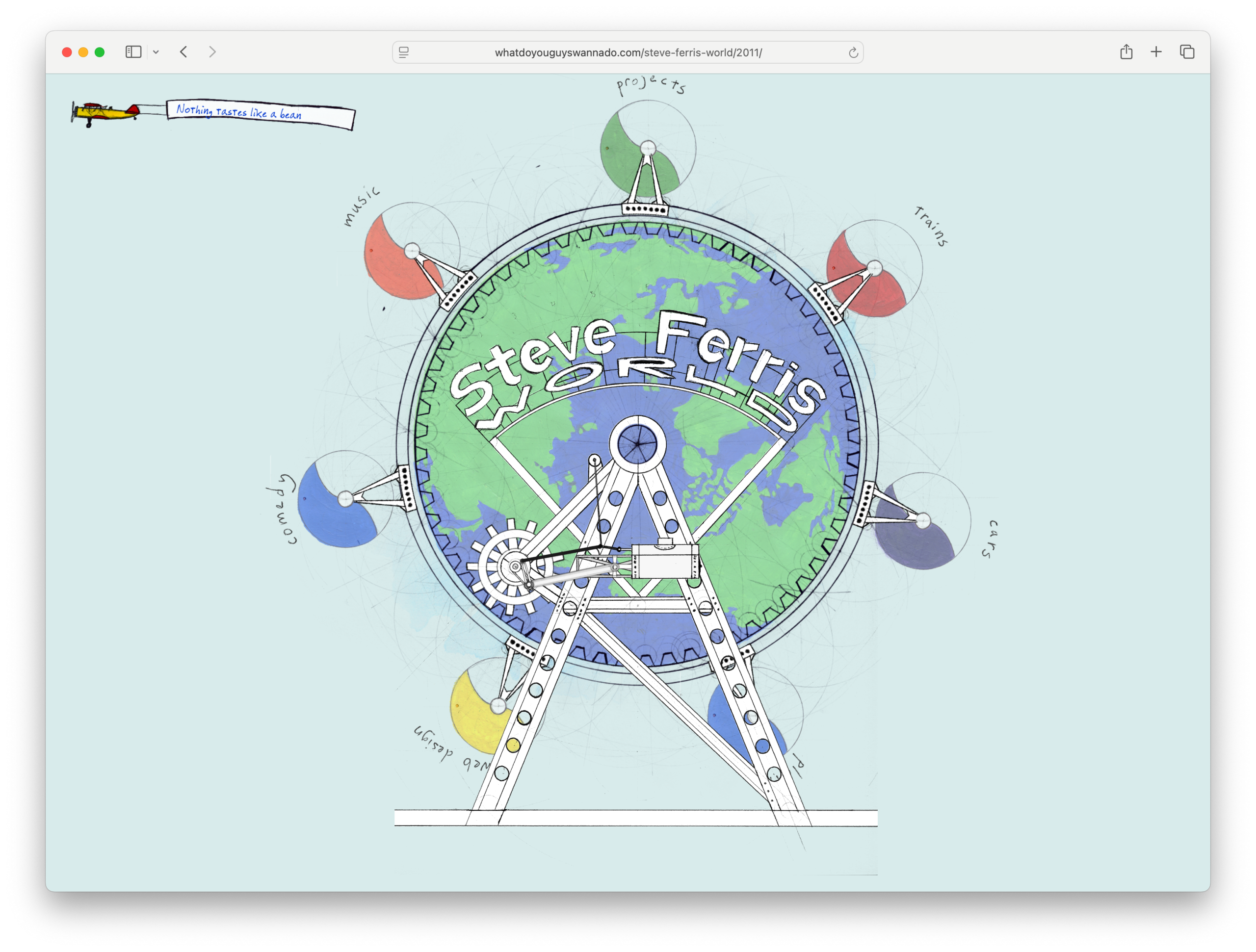 Steve Ferris World was a site about me, showcasing a lot of my talents. It was sort of an experiment, since the animation is pretty complex. Each link displays as a capsule on the Ferris wheel, and my javascript divides the number of links into 360 degrees to find the right placement on the perimeter. That makes it a lot easier to add or remove links down the road. It’s my second hand drawn site.